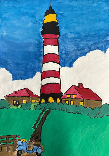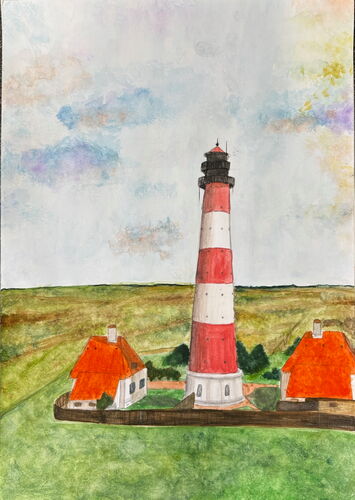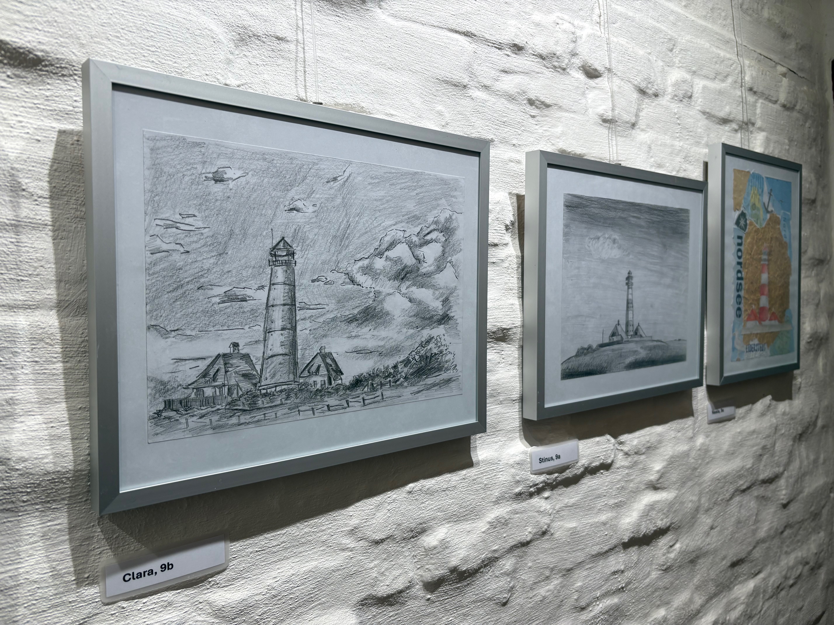 Im Kunstunterricht hatten sich die Schüler:innen intensiv mit dem „Westerhever Leuchtturm – Landmarke & künstlerisches Motiv“ auseinandergesetzt . Dabei ging es nicht nur um die äußere Form des Leuchtturms, sondern auch um seine symbolische Bedeutung als Ort der Orientierung, Weite und Verbundenheit mit der Region.