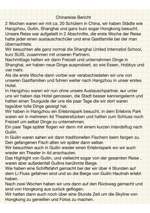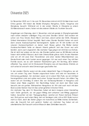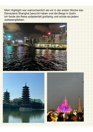 Es war eine sehr schöne Erfahrung, nach China zu fliegen und dort so viel zu erleben. Ich würde es anderen Schülern definitiv weiterempfehlen. Man muss kein Chinesisch sprechen können, auch wenn es hilfreich ist. Um die Sprache muss man sich keine Sorgen machen, zur Not kommuniziert man mit einem Übersetzer oder Zeichensprache. Aber jeder, der die Möglichkeit hat, an dem Austausch teilzunehmen, sollte dies auch tun, da man dadurch viele neue Leute kennenlernt, Freundschaften schließt und ein ganz anderes Land mit einer anderen Kultur kennenlernt. Diese Möglichkeit hat man nicht oft im Leben und deswegen sollte man sie nutzen. Neue Erfahrungen zu sammeln ist eins der wichtigsten Dinge im Leben.