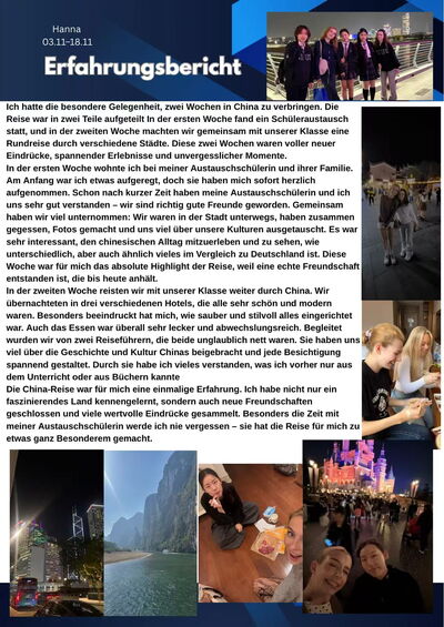 Vom 3. bis 18. November erlebte unsere Schülergruppe eine unvergessliche Austauschreise nach China. Die Teilnehmenden kehrten mit vielen Eindrücken, neuen Freundschaften und spannenden Geschichten zurück.
