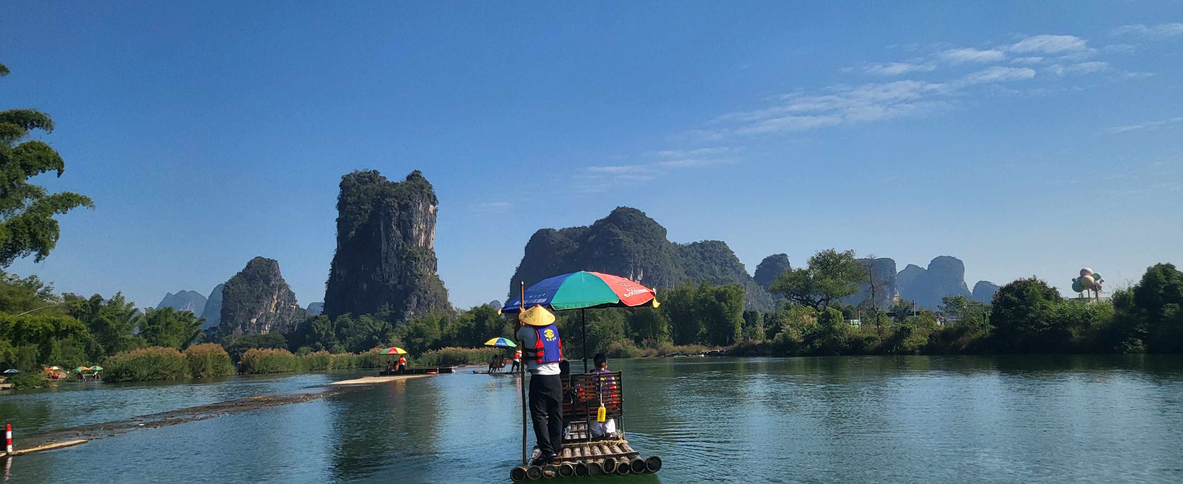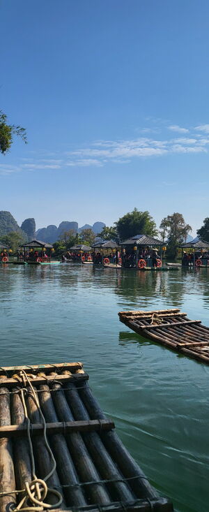 In Guilin haben wir ebenfalls viel erlebt. Eins meiner persönlichen Highlights war eine Bambusfloßfahrt, wir sind auf Bambusfloßen über einen See gefahren und mussten kleine Dämme runterfahren. Es war wie leichtes Rafting. Der Fahrer von unserem Floß hat zwischendurch mit uns auf Chinesisch gesprochen, jedoch haben wir ihn nicht wirklich verstanden. Trotzdem war er sehr toll und lustig. Wir haben halb mit Händen und Füßen kommuniziert, aber er hat mir gute Fototips gegeben und dadurch konnte ich ein schönes Bild von der atemberaubenden hügeligen Landschaft machen. Er hat am Ende der Fahrt sogar mit uns Tiergeräusche unter der Beücke nachgeahmt.