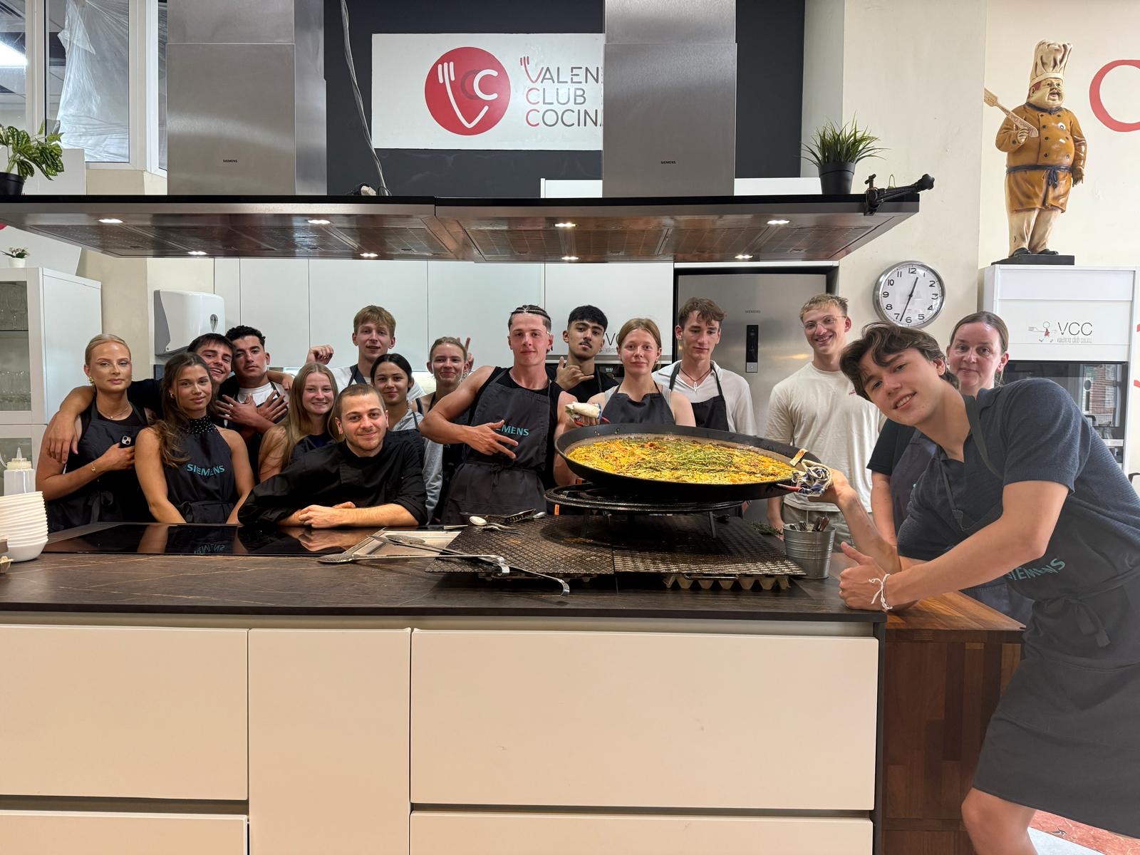 Unter ständiger Anleitung fingen wir nun an, das vorbereitete Gemüse in der riesigen Pfanne anzubraten. Währenddessen bereiteten die Anderen eine typische Tortilla vor. Auch den berühmten spanischen Bizcocho, einen Kuchen, durften wir verkosten. Jeder der Mitschüler versuchte sein Bestes, um gemeinsam eine leckere Paella zuzubereiten. Nach circa einer Stunde war alles fertig gebacken und gekocht und wir konnten unser eigenes Werk gemeinsam am Tisch genießen. Die Paella hat nicht nur fantastisch geschmeckt, sondern uns auch gezeigt, wie sehr Kochen verbindet.